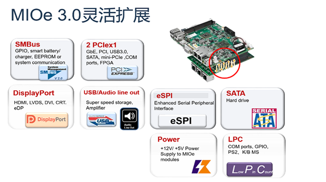 MIOe擴(kuò)展接口是研華自主推行的擴(kuò)展接口標(biāo)準(zhǔn),高度集成的設(shè)計能夠節(jié)約20%的系統(tǒng)空間。MIOe 3.0包含了如下常用的功能信號,客戶可在擴(kuò)展底板上直接使用,從而可將精力投入產(chǎn)品核心功能的開發(fā),大大加速了客戶創(chuàng)新產(chǎn)品上市。